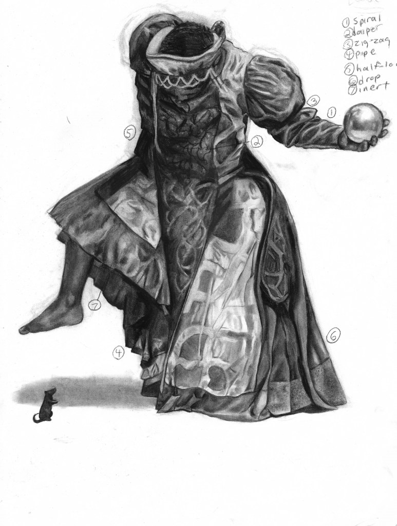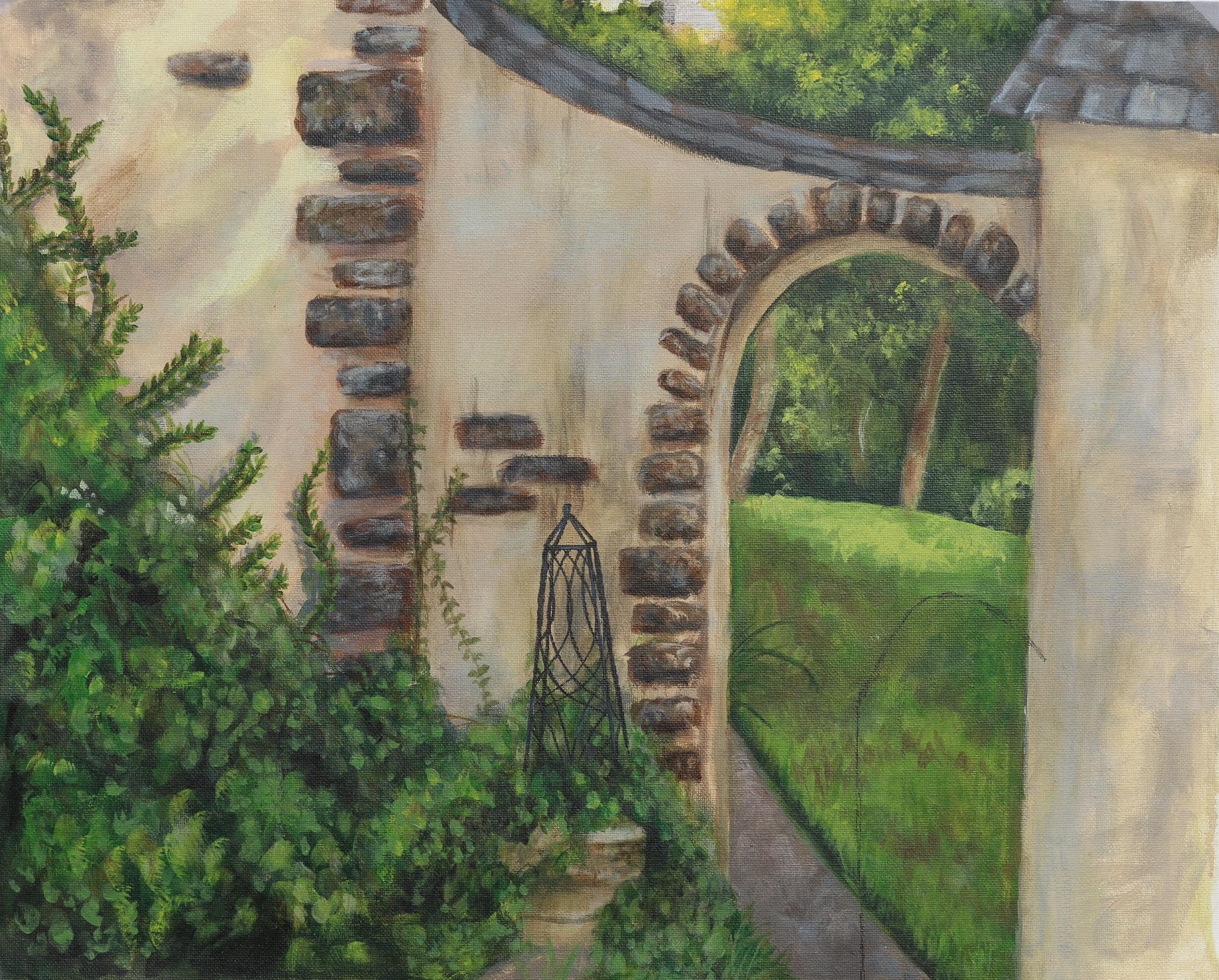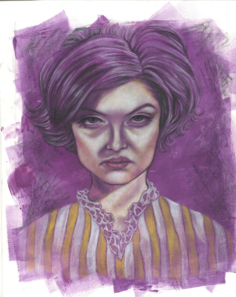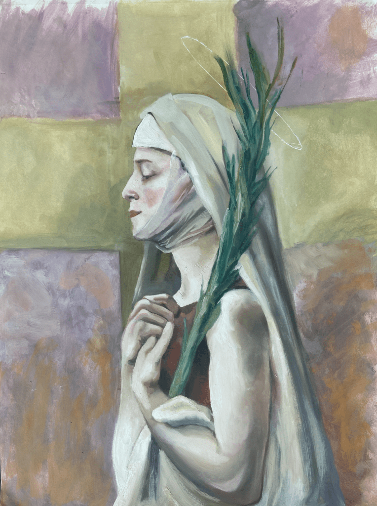 This piece is a mastercopy of a work by Sarah Dodson. The woman pictured is Saint Thechla, and she is depicted in a holy, religious way to reflect her inner self.